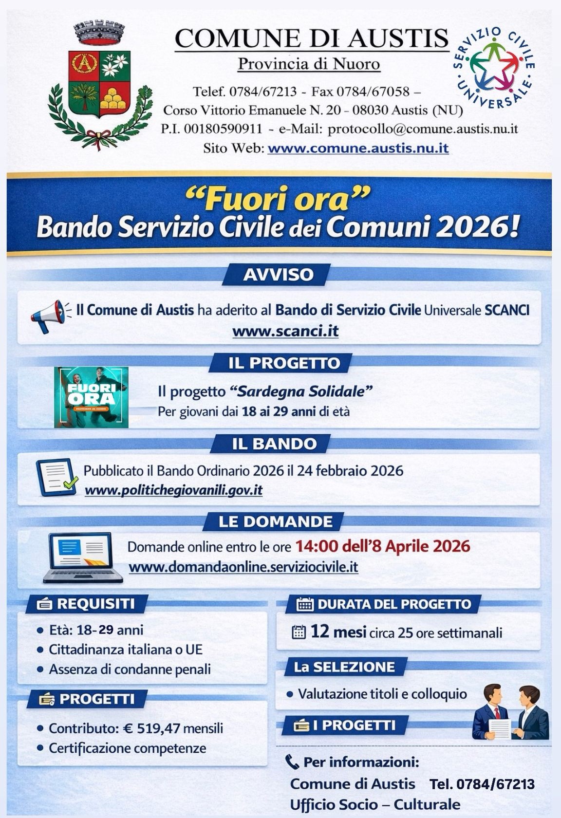 Si avvisano tutti gli interessati che il Comune di Austis ha aderito al bando di Servizio Civile Universale attraverso SCANCI https://scanci.it/